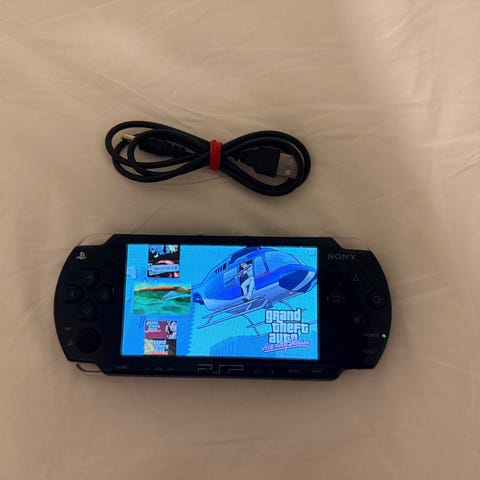 Selger en Sony PSP bærbar spillkonsoll i hvit farge. Lader og 5 spill (se bilde) følger med.