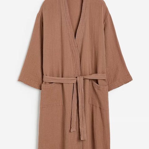 H&M Stone Washed Pure Linen morgenkåpe i størrelse S/M. Morgenkåpen er beige og laget av 100 % lin. Den har et avslappet snitt med lommer og belte i livet. Materialet er lin som gir god pusteevne og komfort.