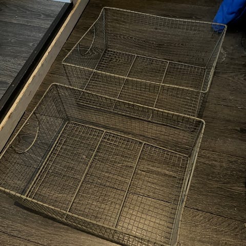 Kurv i metall med håndtak på sidene. Egnet til oppbevaring av ulike gjenstander. 22 cm høy og 30 cm i diameter på det bredeste.