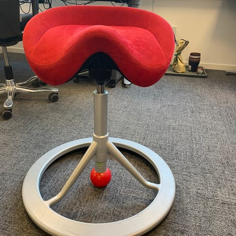 Backapp kontorstol i svart med justerbar høyde. Har noen få bruksmerker, men er ellers i god stand.