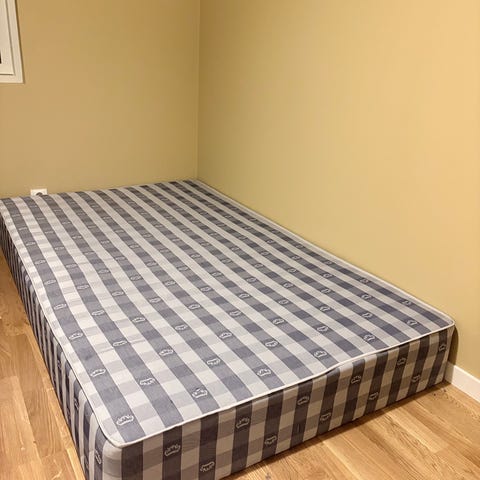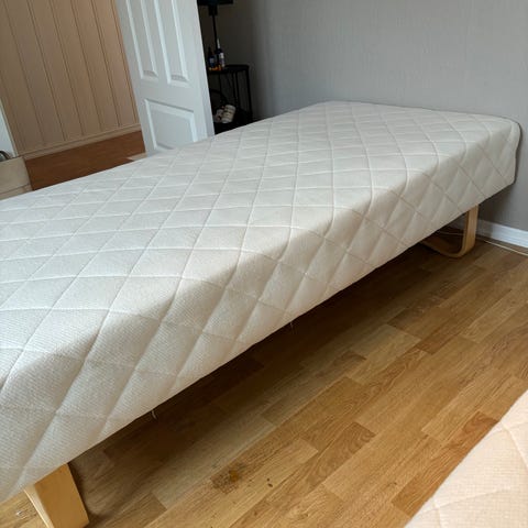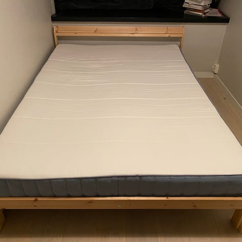 Seng og madrass og over madrassen gir bor pga flytting.