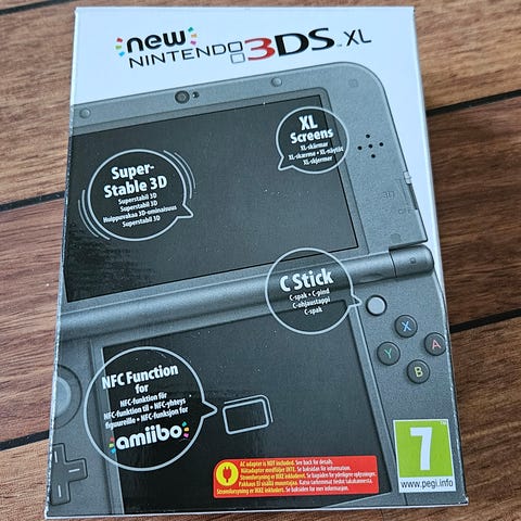 Her selges en Nintendo New 3ds XL. Det følger med med eske + innmat og lader.