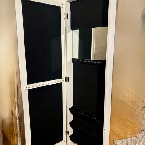 Pent brukt stående smykkeskap med helfigurspeil selges.