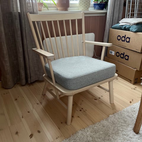 Persbol lenestol fra IKEA i bjørk og grå. Ingen bruksmerker. Ny pris 2295. Mål på bilde 4