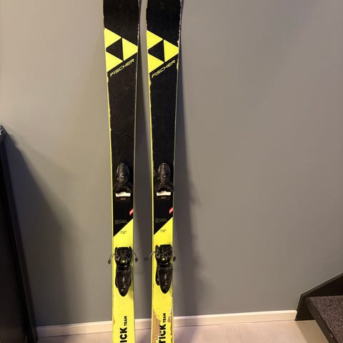 Den ene skien har en skade på baktupp, stålkanten er revet av, men kan fortsatt brukes.
