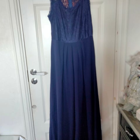 Bonprix maxikjole i størrelse 42. Kjolen er blå og laget av polyester. Den har en overdel med blonder og et skjørt med blomstermønster i blåtoner. Passer til formelle anledninger. Deilig stoff, henger fint på, passer til en som er lang og/eller bruker høye hæler :) Blondeparti på ribbensområdet i tillegg til på brystet.