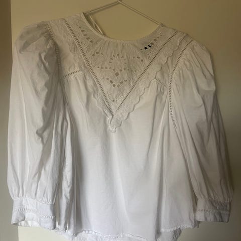 Lindex bluse i størrelse S, laget av bomull. Blusen er hvit og har lange ermer med knappedetaljer. Den har et mønsterstrukturert stoff og en knappestolpe foran, og på håndleddene. Denne sitter nydelig på :)