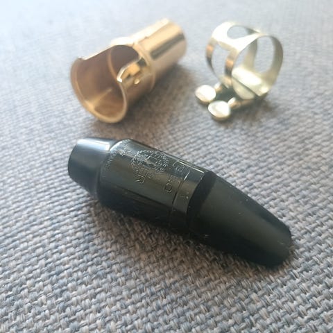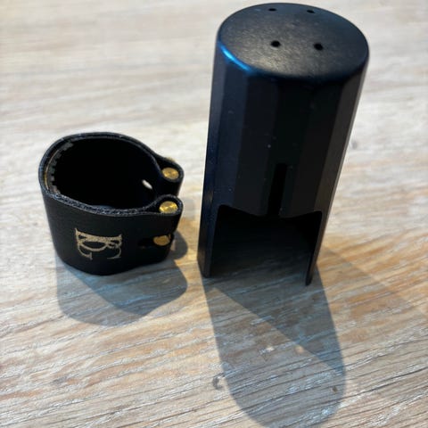 Tror det er et BG ligatur, men logo er nok slitt bort. Passer brede ebonitt munnstykker, men blir for romslig for metall eller smale ebonitt munnstykker.