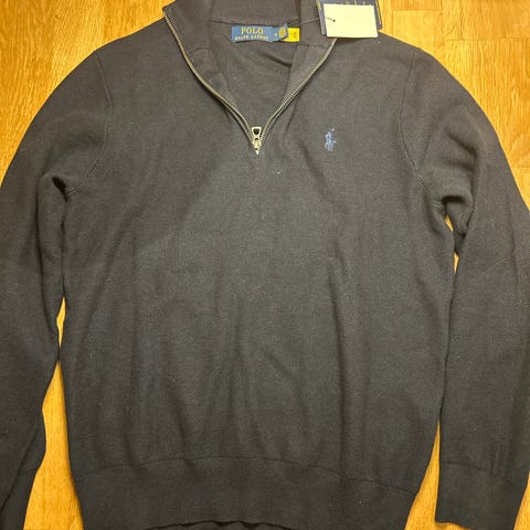 Ralph Lauren Polo genser i blå bomull, størrelse M. Genseren har et strikket motiv av en bjørn med golfutstyr på fronten. Laget i bomullsmateriale og beregnet for menn.