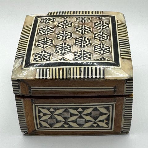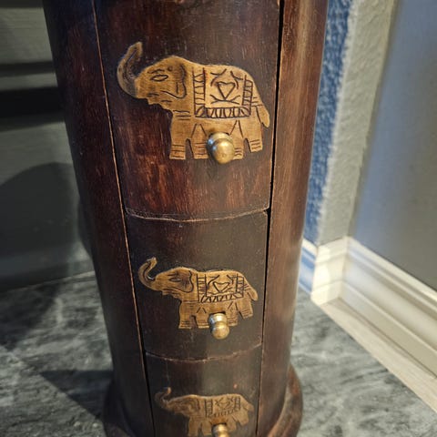 Selger et lite, dekorativt treskap fra India med 4 små skuffer. Skapet er håndmalt med vakre motiver og passer perfekt som smykkeskrin, samleskuff eller pynt i hyllen.
