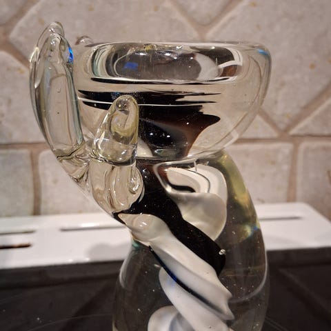Lite stettfat fra den lille glasshytta "Blås ide" i Øksnes. Lakserosa farget glass og klart glass.