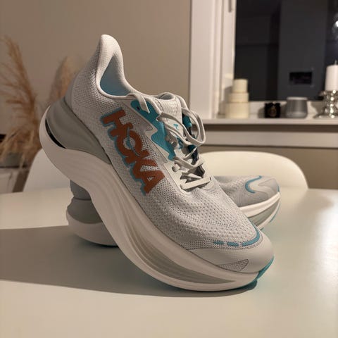 Hoka Skyward X i størrelse 39 1/3 selges. Størrelsen tilsvarer 24,5 cm/7,5 US. Kun brukt få ganger innendørs, på mølle. Selges da jeg på grunn av en kneskade ikke kan løpe på en stund. Fremstår nøyaktig som på bildene. Nypris 3200,-