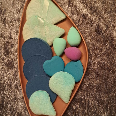 sminkepensel og tilbehør, inkludert flere sminkekoster i ulike størrelser og former, samt en liten beholder for oppbevaring. Produktene er designet for påføring av sminke og ansiktspleie.