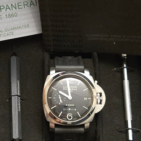 Selger klokke + booklet, medfølger også en pen brun skinnrem med lyse sting og Panerai-spenne.