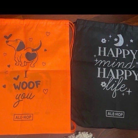 Ale-Hop nett i 2-pakning med trykk. Den ene er oransje med motiv av hund og teksten "I WOOF you", den andre er svart med teksten "HAPPY mind HAPPY life". Egnet til bruk som handleposer eller bæreposer.