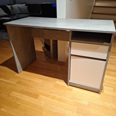 Pent brukt skrivebord fra IKEA , med hylle på og magnetisk tavla. Den kan tas av om man ønsker