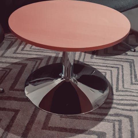 Det er tatt godt vare på, men har to små merker på ene bordkanten samt at det er en liten vannskade på bordplaten. Den er nesten ikke synlig og kan enkelt pusses bort fordi det er heltre.