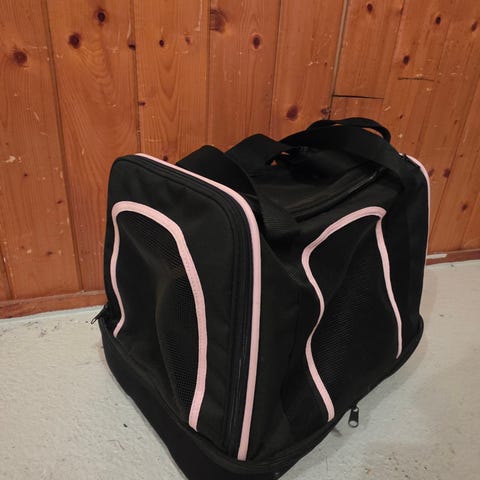 Transportbag til kjæledyr i rosa og svart farge. Designet for transport og oppbevaring av små kjæledyr. Laget av tekstilmateriale med bærehåndtak og skulderstropp for enkel bæring.