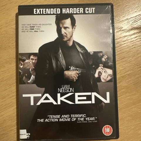 Taken DVD film med Liam Neeson i hovedrollen. Filmen er i standard DVD-format og leveres i plastomslag. Inneholder action- og thrillerinnhold. Norsk tekst.