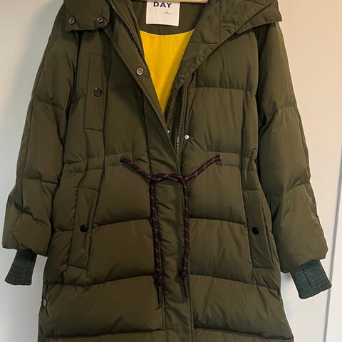 Halvlang dunkåpe fra DAY. Nydelig okergul farge. Vedlig varm og god - har brukt den ned i -15 uten å fryse.