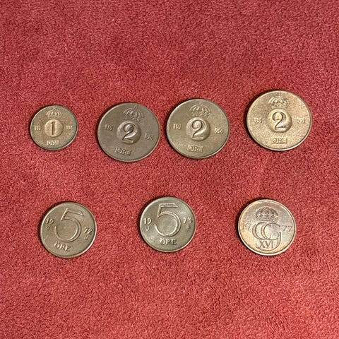 Pris messig har jeg gått ut fra hva andre selgere på finn har lagt seg på. Jeg driver IKKE med samling av mynt/sedel, men ut fra hva jeg har klart å lese meg opp er mynten i kvalitet 1. Sedler i kvalitet 1/1+