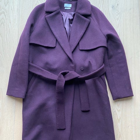 Nydelig burgundy kåpe i 50% ull fra det norske merket Creative Collective i str L, pent brukt kåpe plagget har knapper og belte i midjen.kjøpt for 2999kr på Høyer .selges billig for 200kr