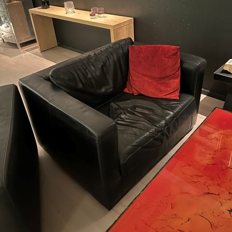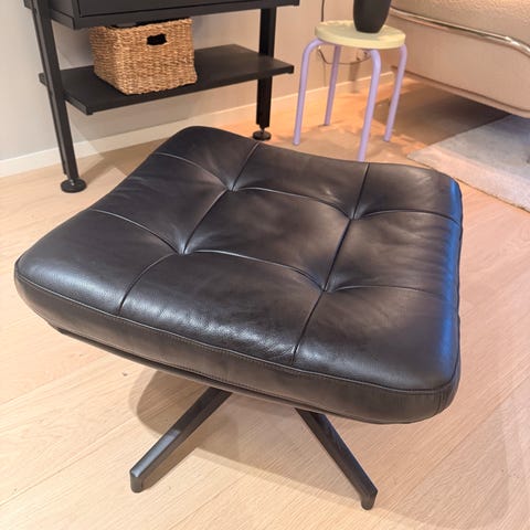 Selger en komfortabel og stilren loungestol i brunt skinnlook med sorte metallben. Stolen har et tidløst design som passer perfekt i stue, kontor eller lesehjørne.