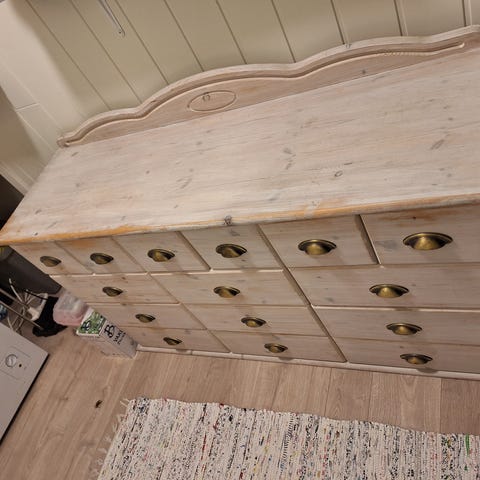 Sjarmerende og solid kjøpmannsdisk med ekte håndverksfølelse. Skuffene er nummererte, noe som underbygger at møbelet er håndlaget. Et unikt innslag for deg som ønsker noe utenom det vanlige. Disken står på henger, og frakt til Oslo og omegn kan ordnes. Pris kan diskuteres ved hurtig avgjørelse, slik at jeg slipper å ta den av hengeren, men kjøre den rett til deg.