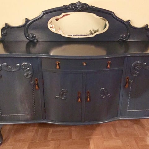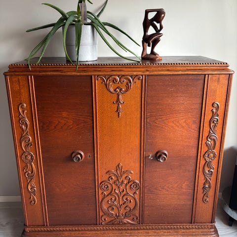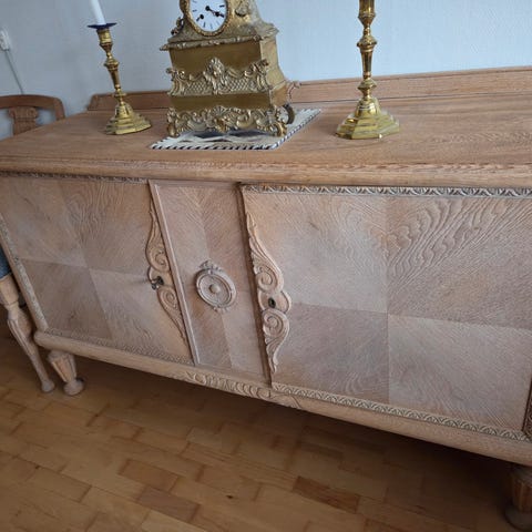 En solid og pen sjenk i eik med fine håndskjærte detaljer. Tidløst design og god kvalitet. Passer fint i stue eller spisestue.