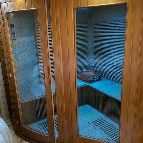 Selger infrarød badstu i solid tremateriale med glassdør og kontrollpanel. Perfekt for hjemmet, badet eller treningsrommet!