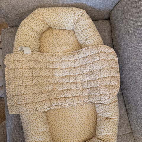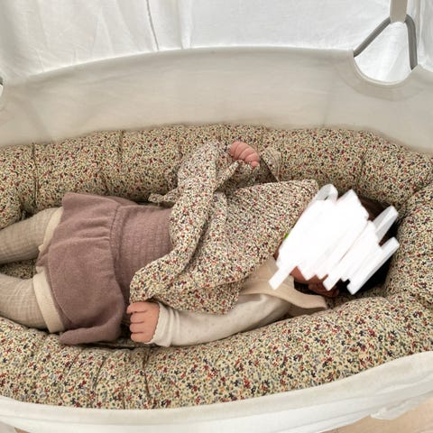 Babynestet er i beige farge med småblomstrete mønster. Den kan både være åpen eller lukket og kan dermed vokse med barnet. Bøylen gir mulighet for å henge opp leker slik at barnet har noe å se på og leke med i øyehøyde. Bøylen er også avtagbar når, noe som øker fleksibiliteten til nestet. Det er noe misfarging på den ene siden etter at nestet har vært oppbevart i en pose (se bilde), det kan godt hende dette bare er å vaske vekk.