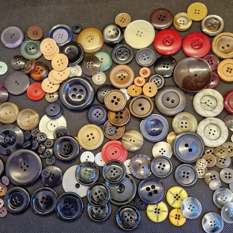Eldre stoffknapper i mange farger og størrelser til salgs.