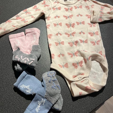 11 Ulvang sokker ( 8 par i størrelse 19-21 og 3 i størrelse 22-24) En Name it ullbody i størrelse 86 og en ullbukse i størrelse 80. Sokkene er kun brukt noe få ganger. Name it buksen har et lite hul nederst på beina som ikke synes mye. Selger alt for 350 kr