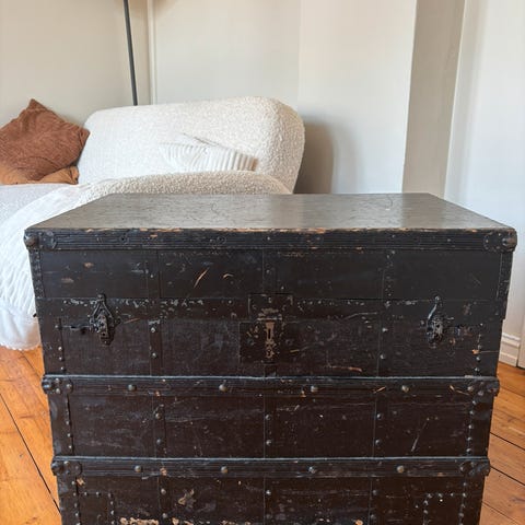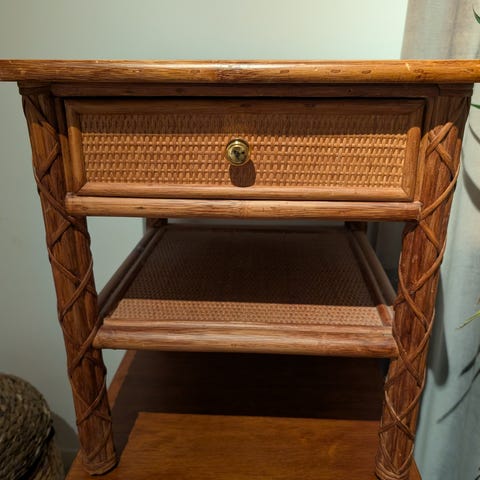 Opprinnelig retro / vintage trekommode som har blitt malt i lys blå. Kan brukes som kommode i gang eller på soverom, eller som nattbord. Har nye skuffeskinner så skuffene er enkle å ta ut.