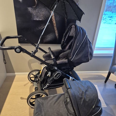 Romslig Emmaljunga NXT liggedel i mørk blå farge. Passer til bruk med Emmaljunga NXT90/NXT60 vogner. Bærehåndtak og ekstra solskjerming på kalesjen. Fortrekk følger også med, men glemte å ta bilde da det mindre brukt. To praktiske lommer på siden. Kan enkelt legges sammen for transport/lagring. Alltid brukt med laken og vognpose.