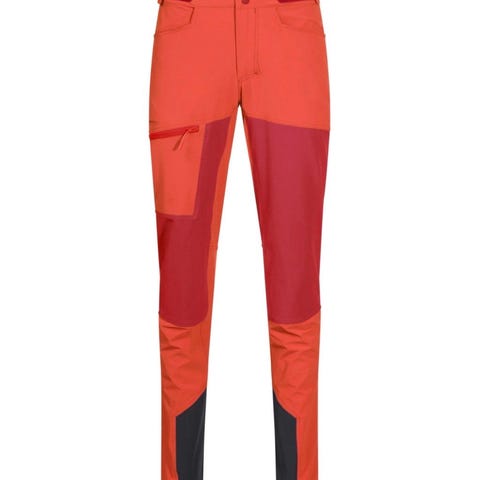 Bergans Cecilie Mountaineering bukse for dame i størrelse M. Buksen er designet for fottur og utendørsaktiviteter. Den er burgunder med mørkeblå detaljer.