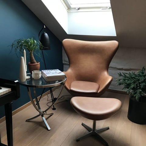 Lenestol og puff i skinn.