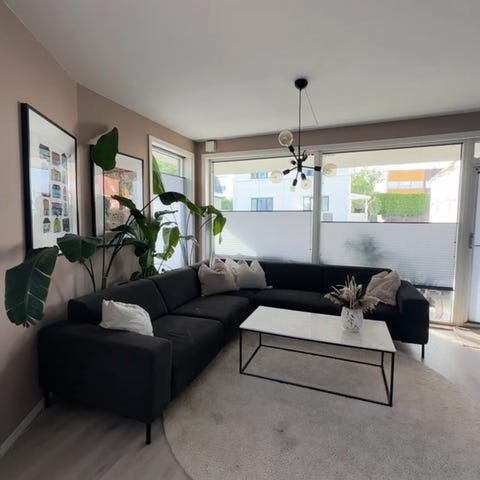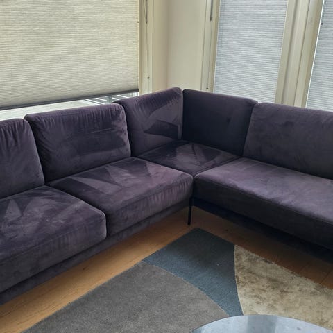 Hel og pen hjørnesofa med sjeselong selges snarest. Følger med flyttbar nakkestøtte. Kjøpt på Bohus for noen år siden.