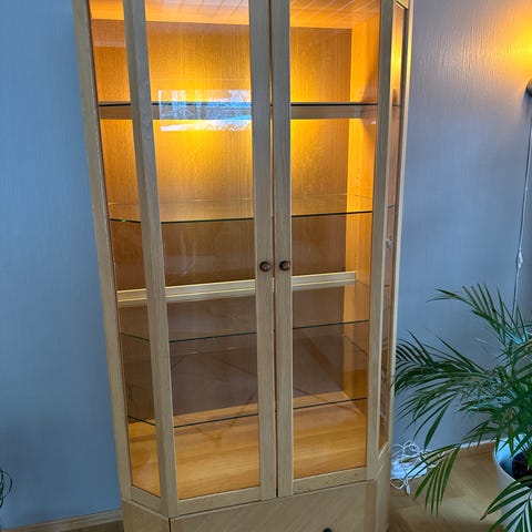 Vitrineskap i eik med glassdører og skuffer