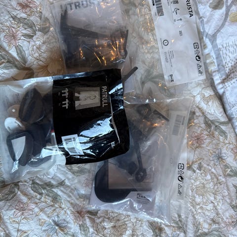Jakke, ulloverdel, uro, lystette gardiner, div. bøker og barnesikringsutstyr