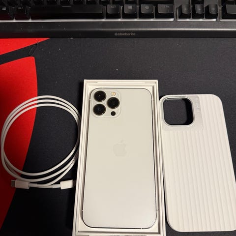 Apple iPhone 13 Pro Max med 256 GB lagringskapasitet. Modellen har en grønn farge og leveres med lader og beskyttelsesdeksel. Telefonen viser batterikapasitet på 82% og har optimalisert batterilading aktivert. Skjermbeskytter og deksel er brukt til hvertid. Finnes selvfølgelig vanlige bruksmerker men ingen sprekker.