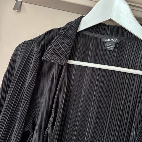 Blusen har sløyfe som kan knytes i halsen og på ermene. Metalltrådene gir blusen en vakker glans.