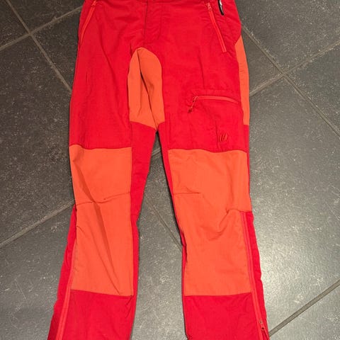 Buksa er justerbar med borrelås i livet, og har glidelås og borrelås nederst. Buksa har noen nupper i setedelen. Se bilder.