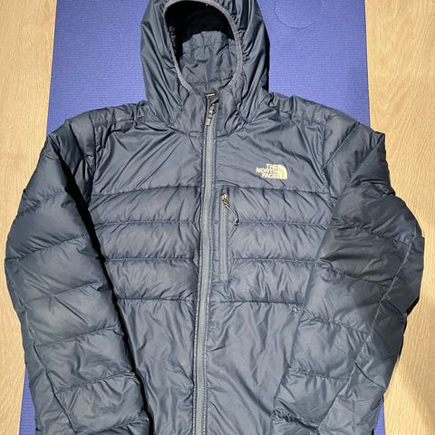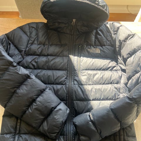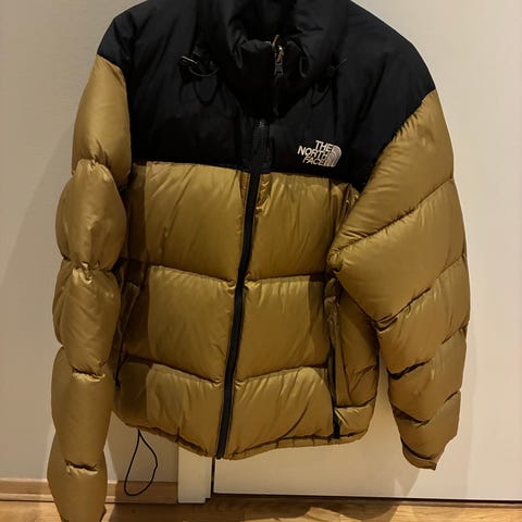The North Face vinterjakke i størrelse M for menn, laget av dunmateriale. Jakken har gul farge med svarte detaljer og er designet for å gi varme i kalde værforhold. Lite merke på armen som er vist på bildet