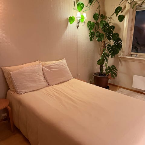 Selve basen er en Snarum rammemadrass. På toppen ligger en Tustna overmadrass. For å holde overmadrassen plettfri, har den hele tiden vært dekket av en Ängskorn madrassbeskytter.