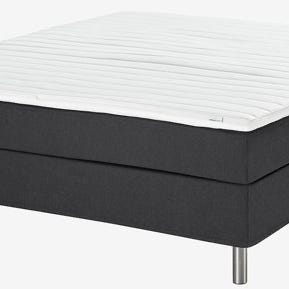 Selger dobbeltseng fra Jysk med praktisk oppbevaring under og matchende sengegavl.