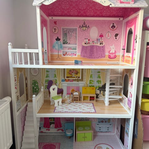 Barbie Dukkehus Lekehus med flere rom og noen møbler. Dette lekebygget har flere etasjer. Ca 120 cm høyt og 85 bredt. Dukkehuset har vært godt brukt og er ikke kjøpt nytt av oss. Lagt ved bilde for å vise type synlig slitasje.