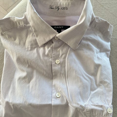 2 langermet bomulls skjorter. En burgunder og en flerfarget grønn/gul/ hvit , og en beige bukse i merke Gant selges.