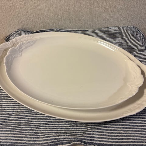 Villeroy & Boch oval serveringsfat laget i hvit porselen. Fatet har dekorative detaljer på kantene og egner seg til servering av mat ved bordet.