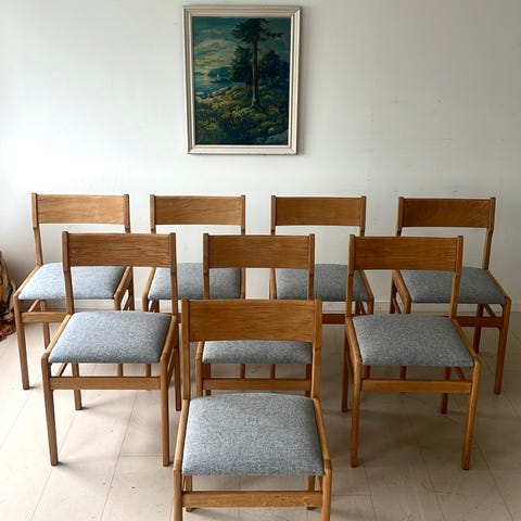 Stoler: Renovert med full puss og oljebehandling. Seter omstoppet med ny skumplast og omtrukket i Hallingdal 130 fra GU som er et ullstoff av svært høy kvalitet.